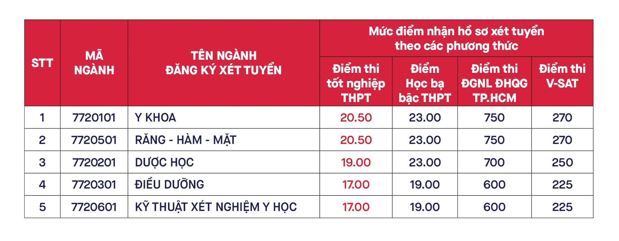 Điều kiện xét tuyển đối với nhóm ngành Sức khỏe (với tất cả các phương thức trừ phương thức xét điểm thi tốt nghịêp THPT): thí sinh cần đạt học lực Tốt hoặc điểm xét tốt nghiệp THPT từ 8.0 trở lên nếu xét tuyển vào ngành Y khoa, Răng Hàm Mặt, Dược học; thí sinh cần đạt học lực Khá trở lên hoặc điểm xét tốt nghiệp THPT từ 6.5 trở lên nếu xét tuyển vào ngành Điều dưỡng, Kỹ thuật Xét nghiệm Y học.