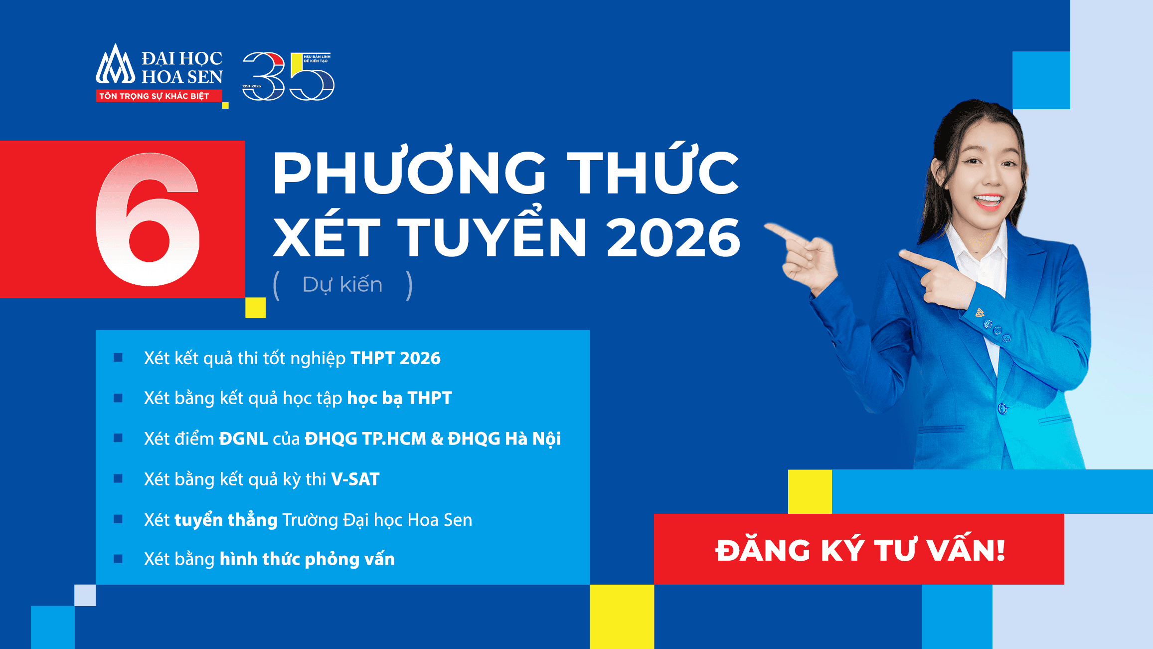 Năm 2026, Trường Đại học Hoa Sen (HSU) dự kiến áp dụng 06 phương thức xét tuyển linh hoạt, giúp thí sinh chủ động lựa chọn phương án phù hợp với năng lực học tập và định hướng cá nhân, gia tăng lợi thế trúng tuyển đại học: