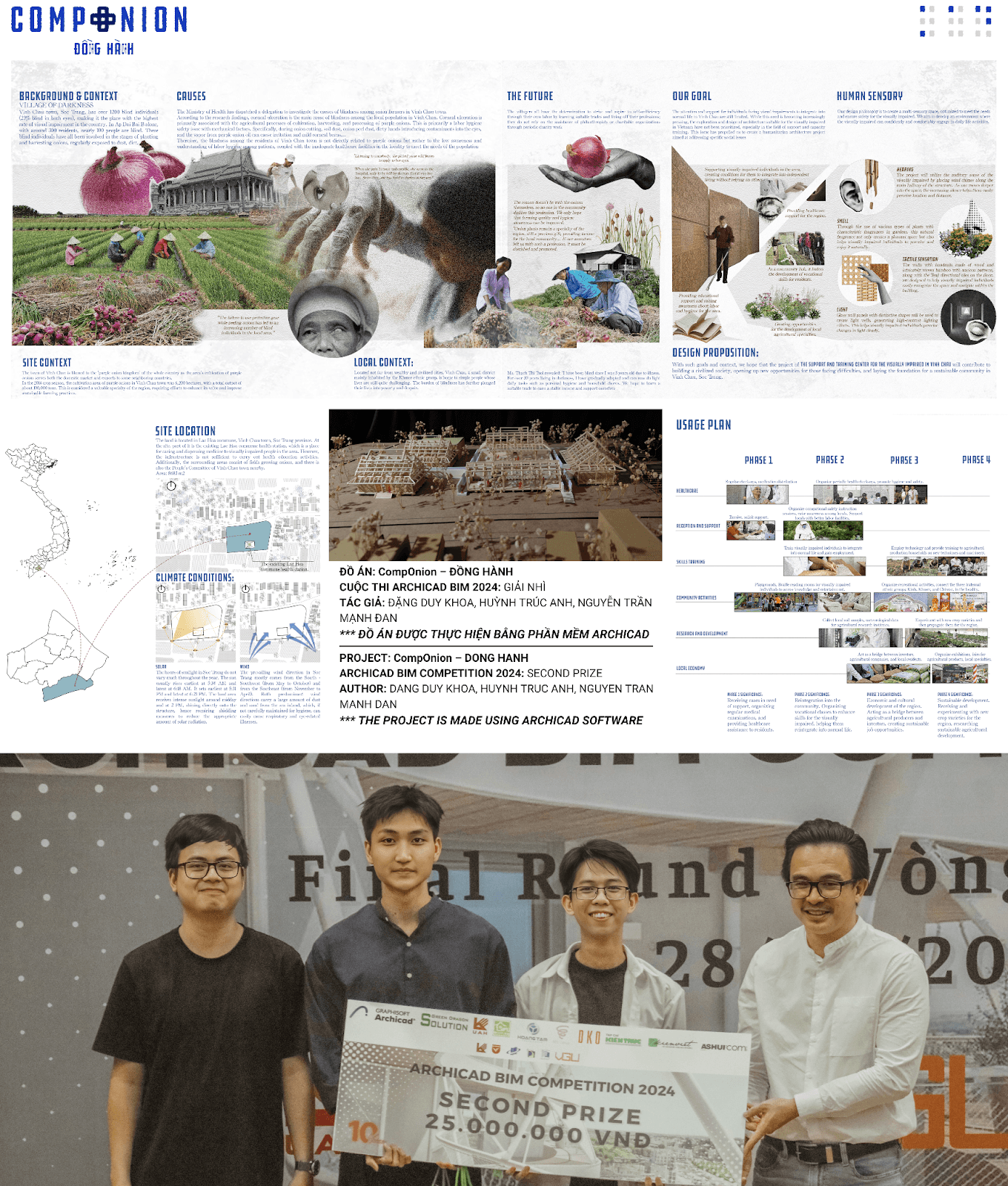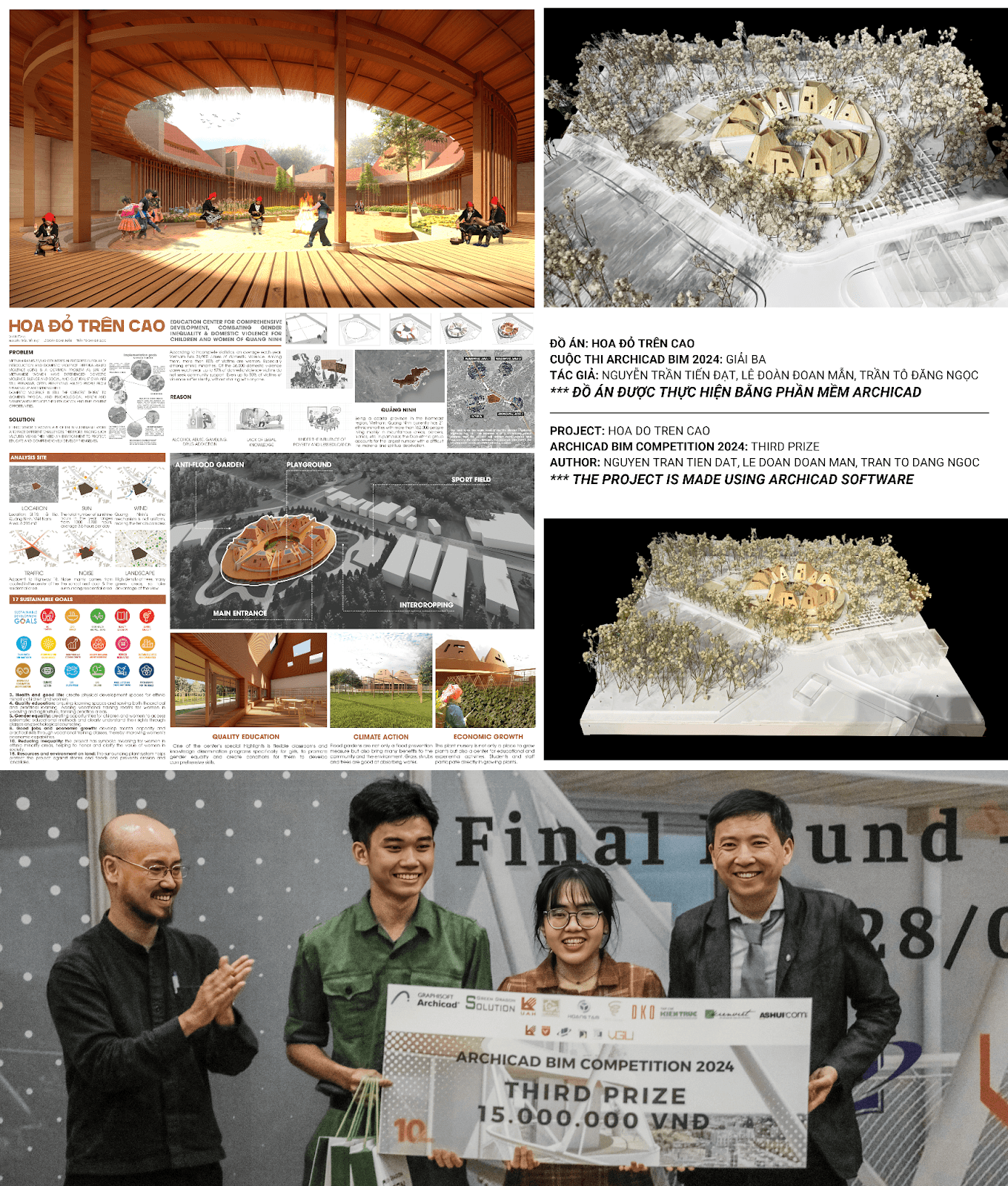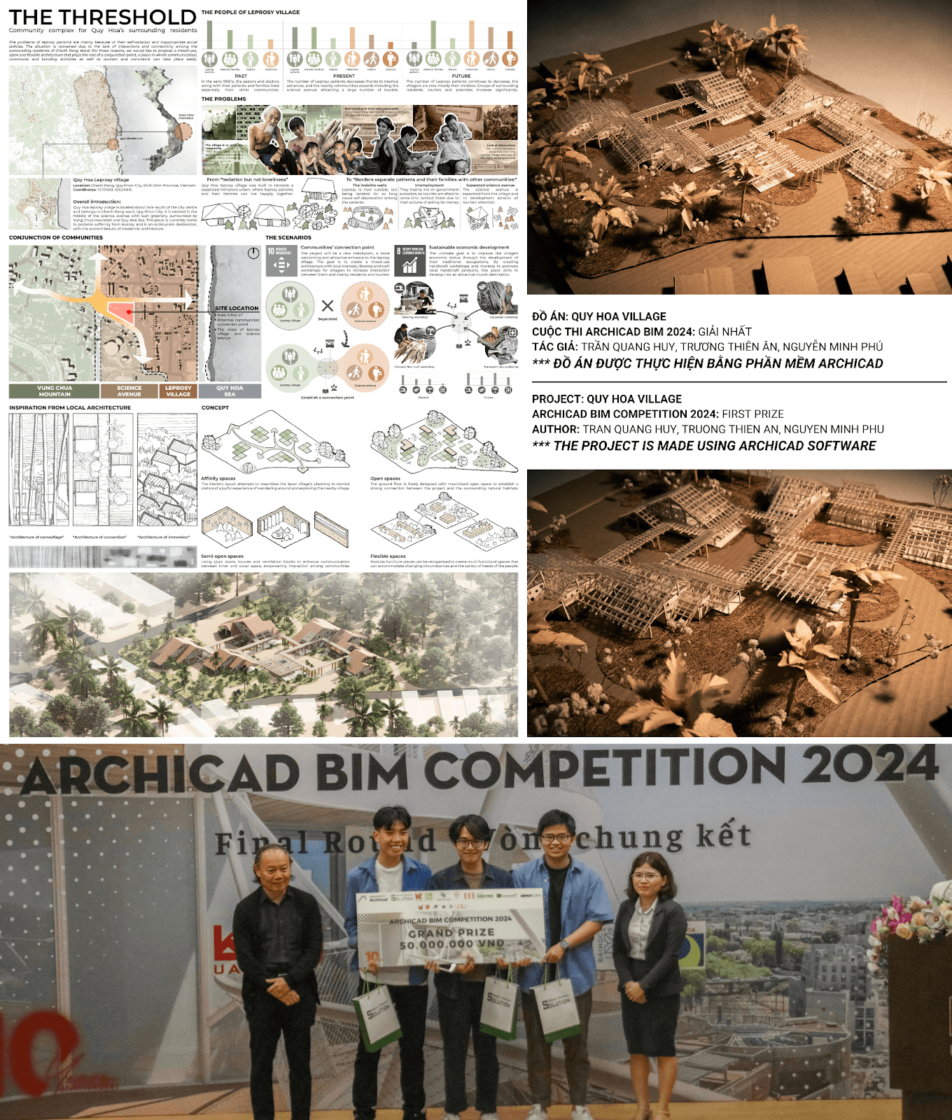 Kết quả chung cuộc, đội The Three Musketeers với 3 chàng trai Trần Quang Huy, Trương Thiên Ân, Nguyễn Minh Phú đến từ trường Đại học Kiến trúc TP.HCM đã xuất sắc trở thành Quán Quân mùa thi Archicad BIM 2024 với dự án “QUY HOA VILLAGE”. Dự án của đội thi đã chinh phục Ban giám khảo từ ý tưởng đến ứng dụng Archicad BIM hiệu quả cùng khả năng thuyết trình ấn tượng.