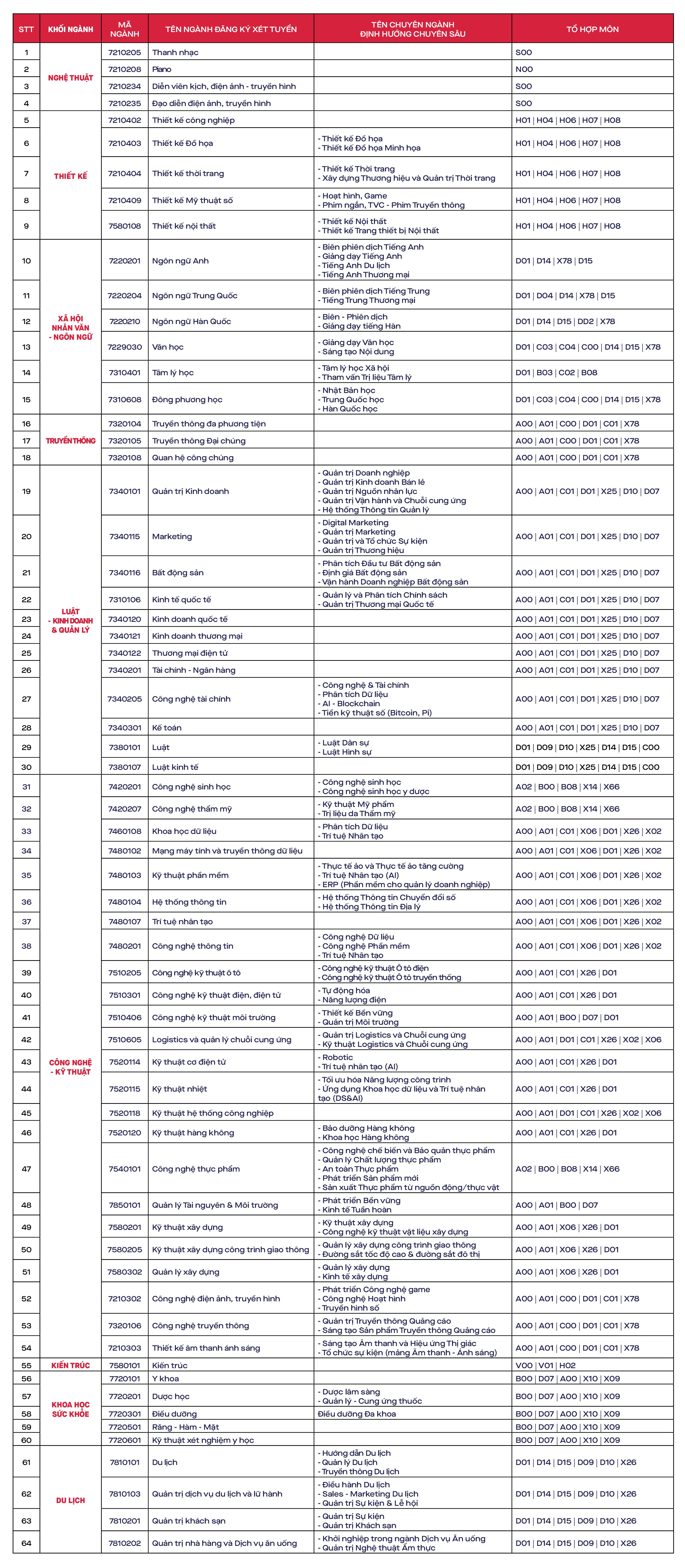 DANH MỤC NGÀNH VÀ TỔ HỢP MÔN XÉT TUYỂN